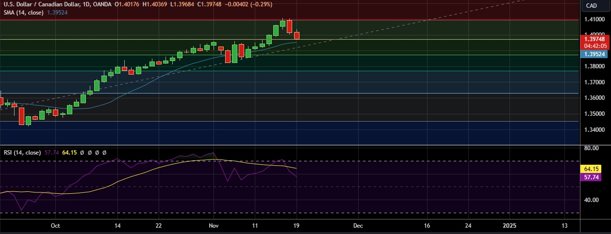• Support is seen at 1.3971(38.2%fib) and break below could take the pair towards 1.3952( (14SMA).