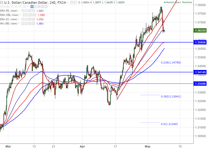 - USD/CAD formed a temporary top around 1.37935 on Friday and started to decline from that level. The pair also broken trend line support 1.3680 (trend line joining 1.32620 and 1.34100) and declined till 1.36393.The major support is around 1.3530 (low made on Apr 27th 2017) and any break confirms that jump from 1.24607 comes to an end at 1.37935. Any break below will drag the pair down till 1.34100/1.32800 (38.2% retracement of 1.2460 and 1.37935).