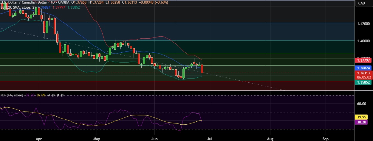 • Support is seen at 1.3584(Lower BB) and break below could take the pair towards 1.3533(23.6%fib).