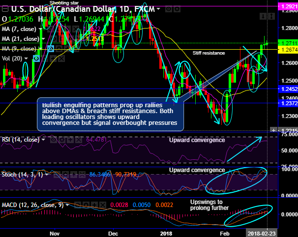 Chart and candlestick patterns: Frequent occurrence of bullish engulfing patterns pop up at 1.2421 and 1.2554 levels and these bullish patterns prop up rallies well above DMAs. In this process of upswings, the bulls manage to breach the stiff resistances of 1.2372, 1.2452, 7&21DMAs and 1.2674 levels (refer daily chart).