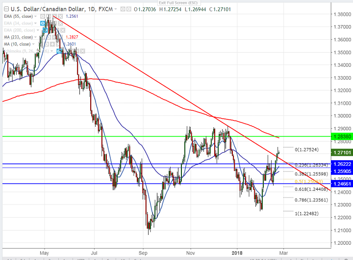 - USD/CAD is continuing its bullish trend and hits fresh 1-1/2 month high on account of weak Canadian retail sales. The pair high of 1.27595 yesterday. It is currently trading around 1.27116. The good jump in USD/CAD yesterday was due to sharp decline in Canadian retail sales.