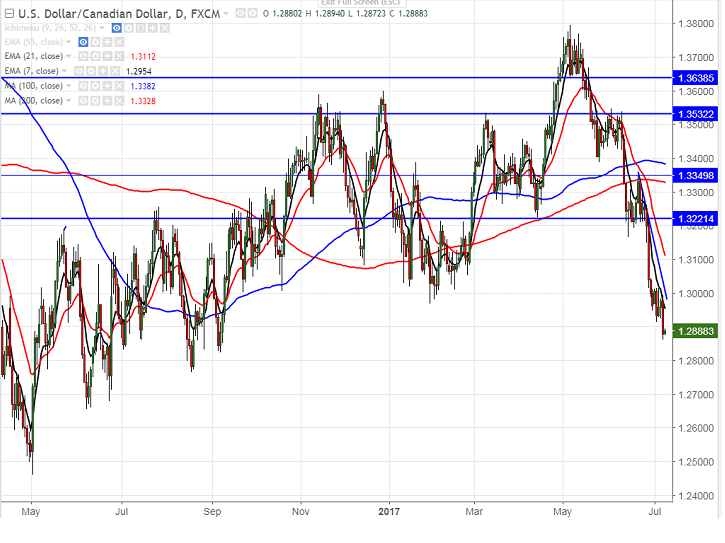 - CAD hits 10- month high on Friday after better than expected Canadian jobs data. The pair broken minor bottom 1.21922 On Jul 4th 2017 and declined till 1.28596 on Jul 7th 2017. It is currently trading around 1.2925.