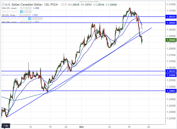 - USDCAD has broken major trend line support yesterday after US fed monetary policy meeting and declined till 1.28298. The decline pair has formed a temporary top around 1.31245 and dipped almost more than 300 pips from that level. The main reason for slight in Canadian dollar was due to good jump in crude oil prices. But downside is limited due to policy divergence between Fed and BOC. It is currently trading around 1.28695.