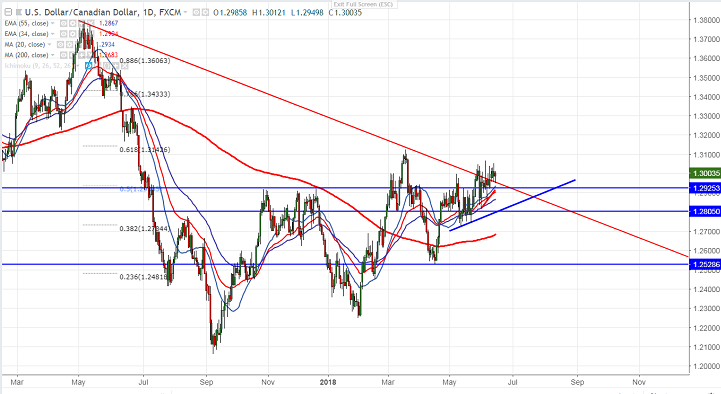- USD/CAD is trading in narrow range between 1.30670 and 1.2850 for past one week. US fed hiked interest rates and was more hawkish than expected. The dot plot shows more than 3 rate hikes this year. Major event for the day is FOMC meeting and markets expects fed to hike interest rates. The Canadian dollar was trading highly volatile this week as US and Canada trade war intensifies. Trade war fears and death of NAFTA are the main issues dragging Canadian dollar. The pair hits intraday high of 1.30516 yesterday and is currently trading around 1.30052.