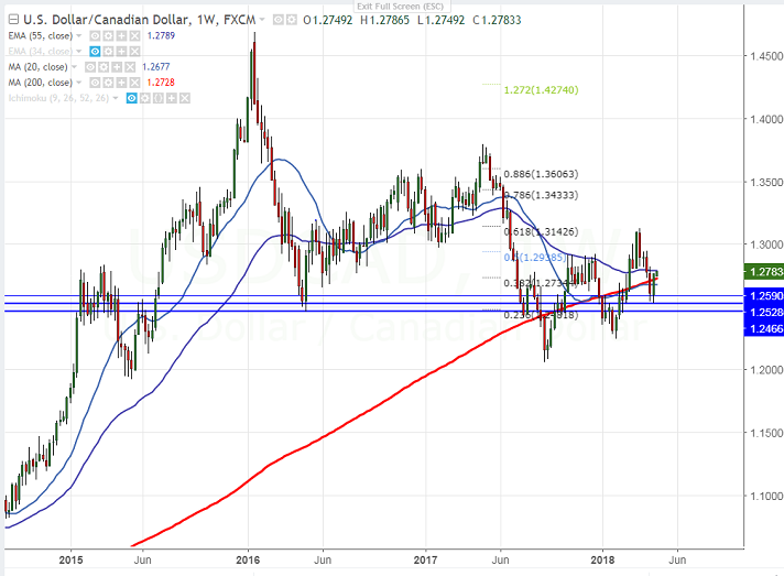 - USD/CAD recovered sharply almost more than 250 pips from the low of 1.25275 made on Apr 17th 2018. Loonie jumped mainly due to weak economic data. The pair hits high of 1.27840 and is currently trading around 1.27850.