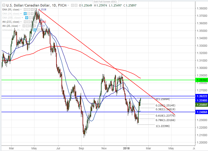 - USD/CAD continuing its bullishness for fifth consecutive days. The pair jumped almost 360 pips form the low of 1.22472. The jump in prices was mainly due to rise in US 10 year bond yields and declining crude oil prices. The pair hits intraday high at 1.25914 and is currently trading around 1.25890.