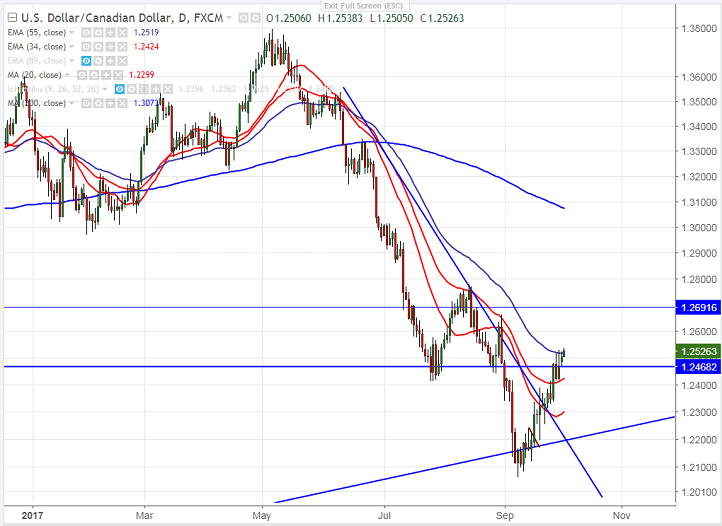 - Canadian dollar declined sharply after two consecutive drop in crude oil prices. The pair recovered after making a low of 1.24168 on Sep 29th 2017. It is currently trading around 1.25214.