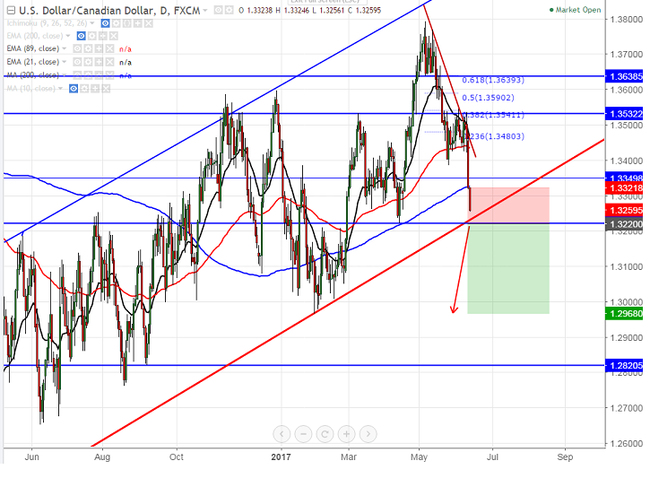 - USD/CAD broken the major support 1.3380 confirms minor weakness but major bearishness can be seen only below 1.3220 level. Any break below will drag the pair down till 1.2968 (Jan 31st 2017 low).