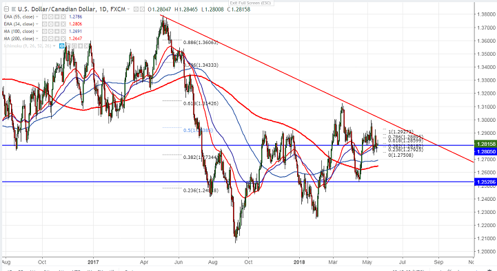- USD/CAD has shown a minor jump from the low of 1.27496 made yesterday on account of deadline passing to reach NAFTA deal. The pair hits high of 1.2845 at the time of writing and slowly declined due to rising oil prices. It is currently trading around 1.28190.