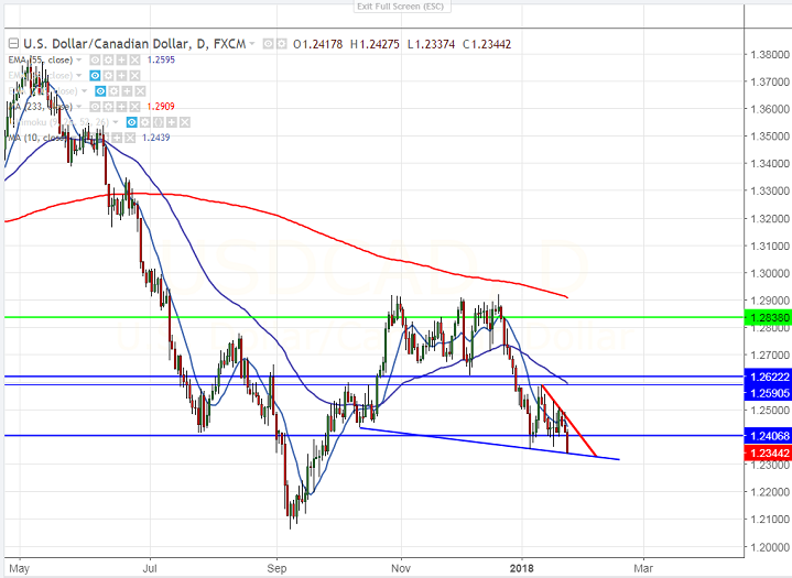 - USD/CAD has declined sharply after recovering till 1.250. The pair broken major support of 1.23550 on Jan 5th 2018 low and declined till 1.23478. It is currently trading around 1.23515.