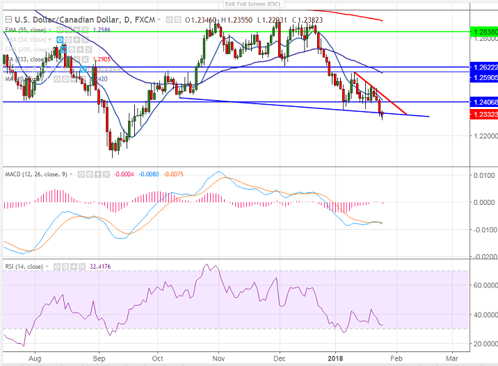 - USD/CAD has declined sharply after recovering till 1.250. The pair broken major support of 1.23550 on Jan 5th 2018 low and declined till 1.23478. It is currently trading around 1.23515.