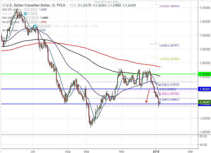 - CAD outperformed USD and enjoyed more than 150 pips rally in 2018. USD/CAD declined sharply after forming temporary top around 1.29202 on Dec 19th 2017. The main reason for the rally in Canadian dollar is due to better than expected Canadian jobs data. The pair hits low of 1.2355 and is currently trading around 1.24369.