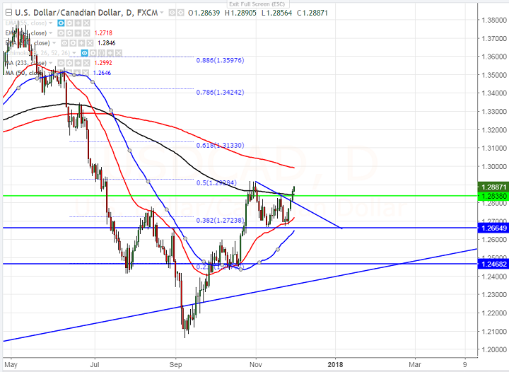 - USD/CAD is trading higher for the past three days on account of weak crude oil price and broad based buying in US dollar. US dollar was trading higher against all major yesterday after better than expected US GDP data. The pair has broken major resistance 1.2845 (200- day EMA) and jumped till 1.28885. It is currently trading around 1.28882.