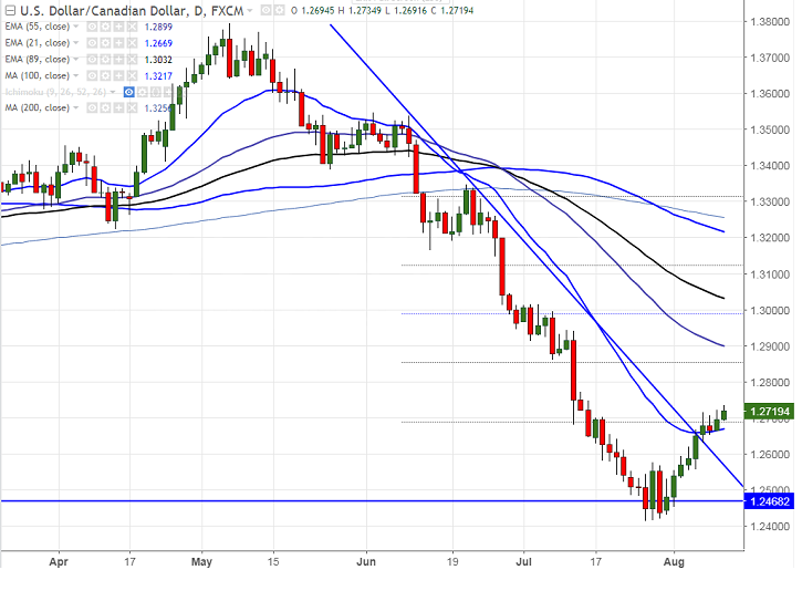 - USD/CAD has broken the high of 1.27145 made on Aug 7th 2017 and jumped till 1.27349 at the time of writing. The pair formed a minor bottom around 1.2650 and is currently trading around 1.27245.