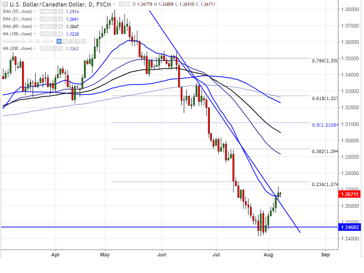 - USD/CAD has made a high of 1.27145 and slightly declined from that level till 1.26510 at the time of writing on account slight increase in crude oil price. The pair declined till 1.2650 at the time of writing on and is currently trading around 1.26735.