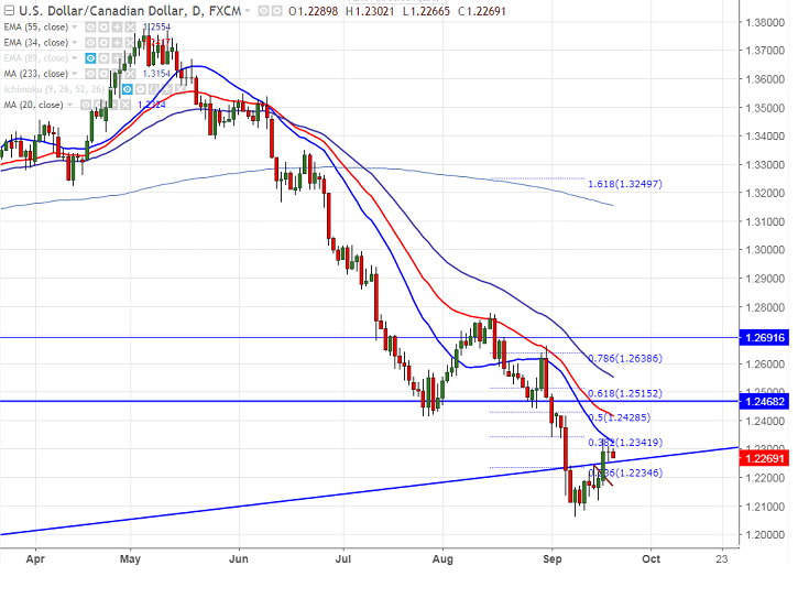 - USD/CAD has formed a bottom at 1.20613 on Sep 8th 2017 and recovered well from that level. The pair upside is limited due to strong oil prices. The pair jumped till 1.23376 and is currently trading around 1.22735.