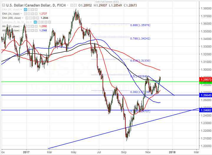 - USD/CAD is trading higher consecutively for the past four days on account of weak crude oil price and rising US 10 –year bond yields. The pair has broken major resistance 1.2845 (200- day EMA) and jumped till 1.29094. It is currently trading around 1.28690.