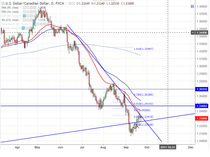 - USD/CAD has declined sharply after showing a pullback till 1.23905 on Sep 20th 2017. The pair pared its gain after better than expected Canadian whole sale trade released yesterday. The pair upside is capped by 50% retracement and any further bullishness can be seen only above that level. It is currently trading around 1.23025.