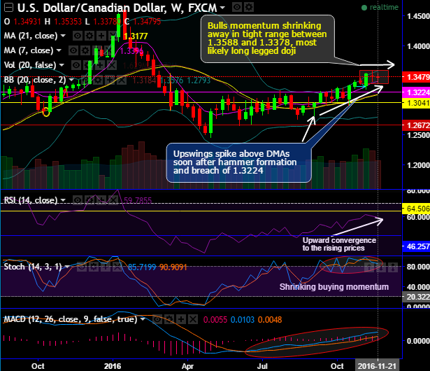The US dollar bulls seem to have taken a halt in the tight range between 1.3588 and 1.3378 against CAD, the bulls’ momentum shrinking away in tight range, after last week’s long legged doji formation at 1.3496 levels, this week again the formation of long legged doji is the most likely (see weekly plotting).