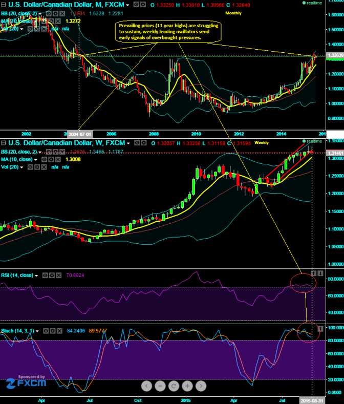 Currently the pair was not able to sustain its 11 years highs of 1.3352 levels and has breached trendline support at 1.3232 levels; if we have to compare the same with weekly plotting then we arrive with an attempt of signaling overbought pressure. And on monthly chart, it evidences the saucer pattern a rounding bottom of the prolonged downtrend can used to suggest that the long term trend is reversed. But let's wait for more confirmation for another 2-3 days in order to come up with long term stance.