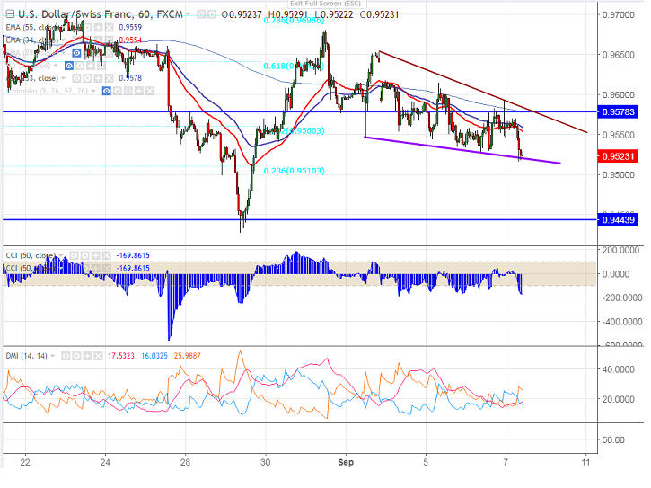- Any break below 0.95160 will drag the pair down till 0.94285/0.9345. The near term resistance is around 0.9560 and any break above will take the pair to next level till 0.9595/0.9630. Break above 0.9630 targets 0.9680/0.9700.