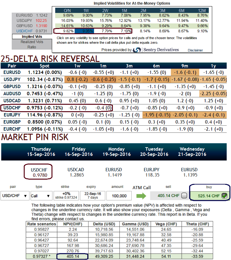 The current ATM implied volatilities have slipped below 10% after SNB maintained status quo in its monetary policy, (unchanged rates at -0.75%), 1w tenors have also reduced to 9.05%. Whereas 1w ATM calls are priced at 29.6%.