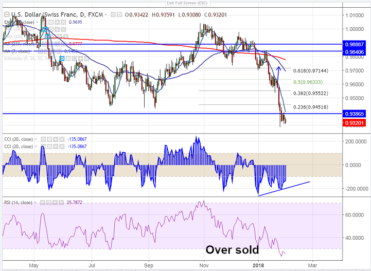 - USD/CHF is trading flat after a 685 pips dip from high of 0.99770 made on Dec 8th 2017. The pair hits low of 0.9288 and is currently trading around 0.93170.