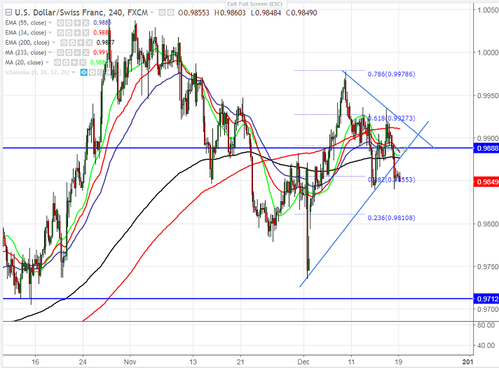 - USD/CHF has declined almost 70 pips from the yesterday high of 0.99170. The pair is consolidating below 78.6% retracement at 0.9975. The pair was trading low due to slight weakness in US dollar index. US tax bill reform has minor impact on US dollar. It is expected to be passed in mid-day of this week. But no big movement is expected as holiday season going to start next week. The pair hits low of 0.98396 yesterday and is currently trading around 0.983837.