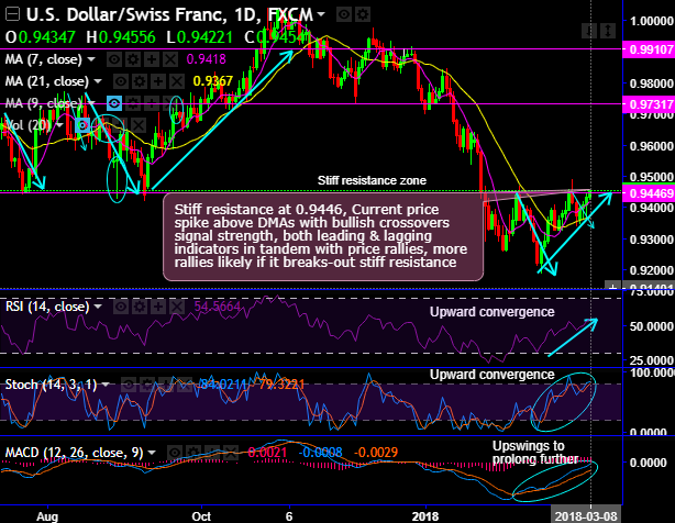 On the flip side, on daily plotting, the stiff resistance is observed at 0.9446 levels, the current price spike above DMAs with bullish crossovers signal strength, while both leading & lagging indicators in tandem with price rallies. We could foresee more rallies only if it breaks-out stiff resistance.