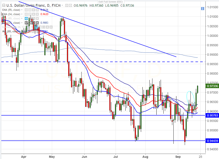 - USD/CHF has broken major resistance at 0.9705 high made on Sep 14th 2017 after hawkish Fed statement. The pair has formed a minor bottom at 0.95650 on Sep 15th 2017 and trading higher from that level. It is currently trading around 0.97350.