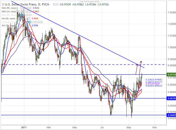 - The near term resistance is around 0.97730 (Aug 8th 2017 high) and any convincing break above will take the pair to next level till 0.9808/0.9845/0.9900.