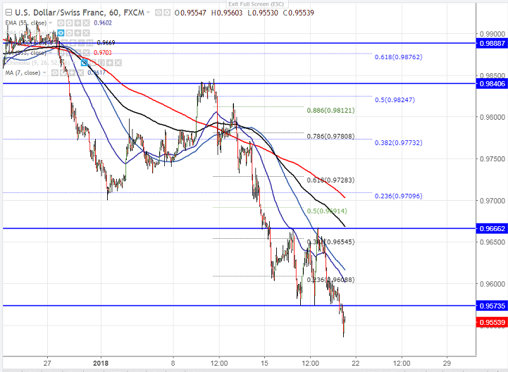 - USD/CHF has broken major support 0.9570 after showing a recovery till 0.9660. The pair declined almost 90 pips from the low. It has recovered till 0.96667 and is currently trading around 0.9550.