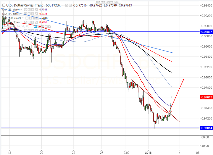 - USD/CHF has recovered slightly form the low of 0.96997. The pair breaks minor trend line resistance at 0.9730 and jumped till 0.97635 at the time of writing. It is currently trading around 0.97636.