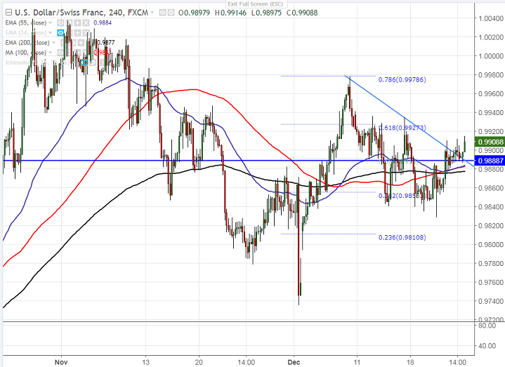 - USD/CHF recovered almost 70 pips from the low of 0.98284. The pair is consolidating below 78.6% retracement at 0.99786. The pair was trading flat after mixed economic data from US. Headline US durable goods order rose 1.3% in Nov below forecast of 2.2%. US Personal income came at 0.3% compared to expectations of 0.4% and spending rose to 0.6% compared to forecast of 0.5%. The pair hits high of 0.99115 yesterday and is currently trading around 0.99090.