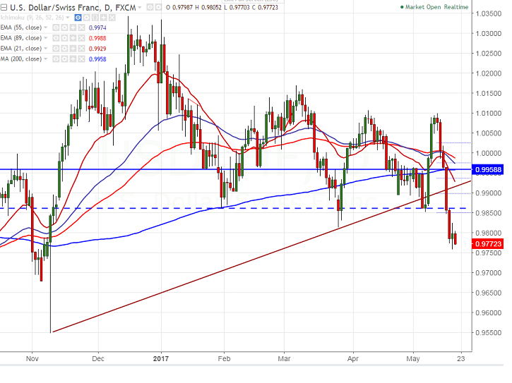- USD/CHF continues its losing streak for the fifth consecutive days and has closed well below the major support at 0.9812 low formed on Mar 27th 2017. The pair hits 0.97590 yesterday and is currently trading around 0.97725.