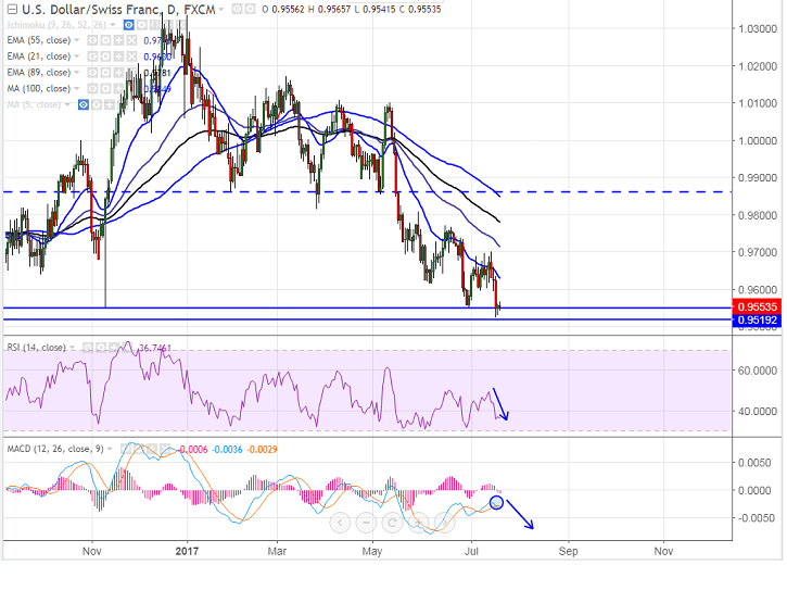 - USD/CHF downside has been paused after hitting low of 0.95237 and shown a minor recovery from that level. It has jumped till 0.9565 level. It is currently trading around 0.95488.