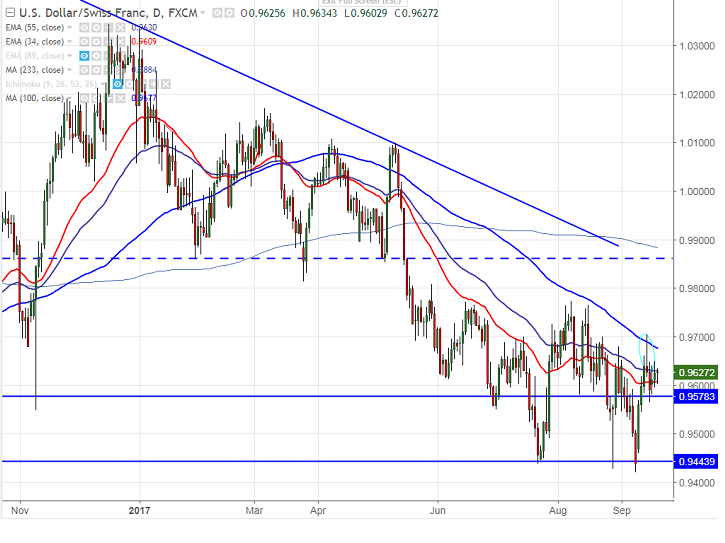 - USD/CHF is consolidating in narrow range between 0.9705 and 0.95650 for the past four trading session. The pair has formed a minor bottom at 0.95650 on Sep 15th 2017 and jumped slightly from that level. It is currently trading around 0.96270.