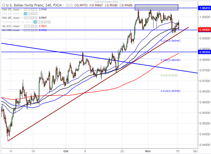 - USD/CHF has shown a minor jump after forming a bottom around 0.99218 on Nov 9th 2017 low. The pair declined till 0.99218 and is currently trading around 0.99380.