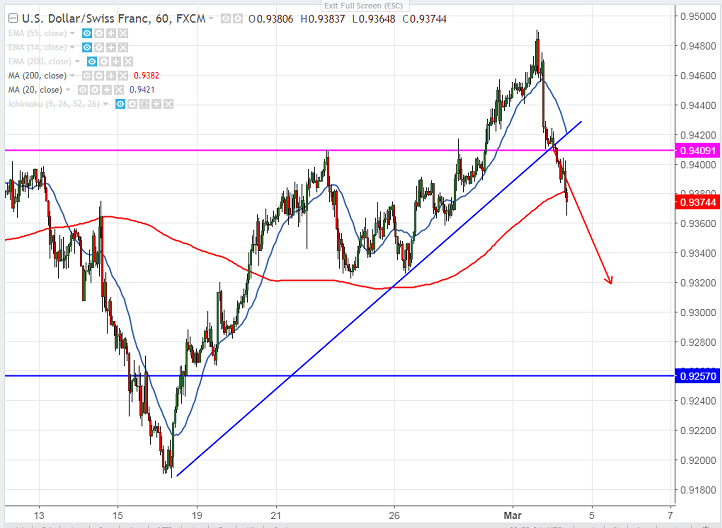 - USD/CHF has shown a major decline after hitting high of 0.94900 and is trading below 200- H MA. The pair formed almost triple bottom at 0.9320 and any bearish continuation can be seen below that level. level. The pair hits intraday low of 0.93640 and is currently trading around 0.93745.