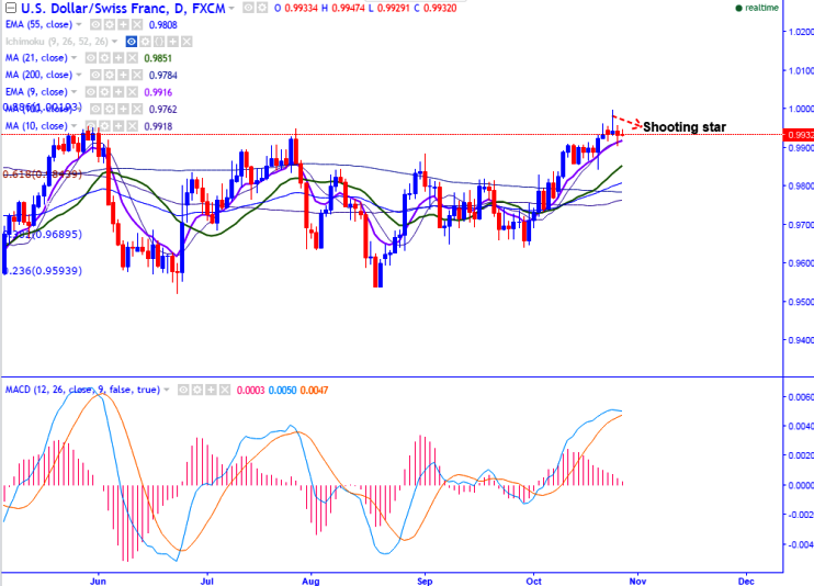 - The pair jumped sharply till 1.000 on 25th Oct and declined sharply from that level. It is trading around 0.99336.
