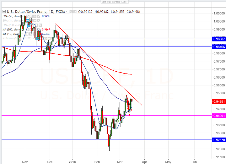 - USD/CHF has shown a good recovery after hitting low of 0.9425. The pair jumped till 0.9520 yesterday slightly near to the high of 0.95345 (Mar 9th 2018 high). It is currently trading around 0.94965.