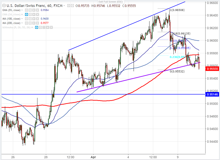- USD/CHF has declined almost 100 pips from the previous week high of 0.96475. The slight jump in Swiss franc was mainly due to increase of safe haven asset as US- China trade war tension escalates. It is currently trading around 0.95558.