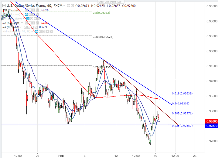- USD/CHF has shown a minor recovery of almost more than 100 pips from the low of 0.91876 made on Friday. The pair hits high of 0.9300 and is currently trading around 0.92770.