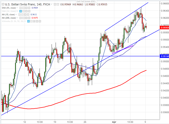 - USD/CHF has shown a good selling pressure after hitting high of 0.96496 yesterday. The pair weakness was supported by weak US jobs data and US- China trade worries. The trade war has increased demand of safe haven assets like gold and Swiss franc. It is currently trading around 0.95932