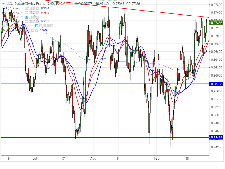 - USD/CHF is consolidating between 0.97474 and 0.96419 for the past four trading session. USD/CHF has formed a minor bottom around 0.96419 and showing a minor recovery from that level. The weakness in Swiss franc is capped due to escalation of geopolitical tensions between North Korea and U.S. The pair is trading slightly above 0.9700 and is currently trading around 0.97347.