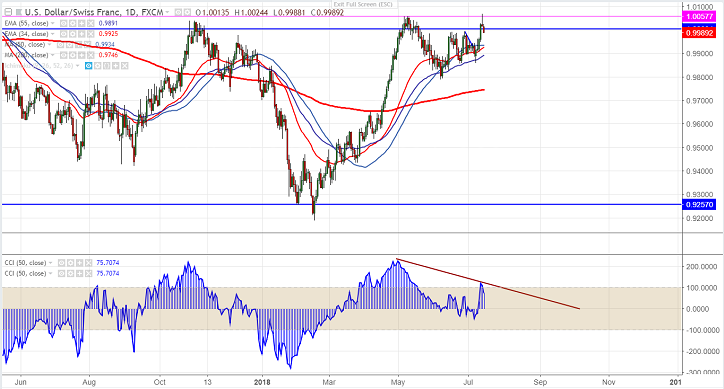 - USD/CHF has shown a good jump of more than 200 pips yesterday from the low of 0.9855 made on Jul 9th 2018. The pair hits high of 1.00680 and declined more than 70 pips on slightly weak dollar.US CPI and PPI data came better than expected. Market eyes US retail sales data and Trump-Putin summit for further direction. The rise in inflation confirms more than two rate hikes by fed in this year. The downside is capped due to policy divergence between US fed and SNB.The pair hits intraday low of 0.9988 at the time of writing. It is currently trading around 0.99890.