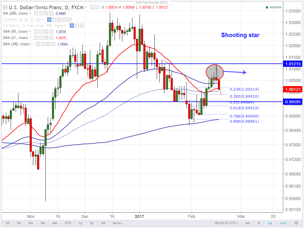 FxWirePro: USD/CHF forms shooting star in daily chart, good to sell on rallies