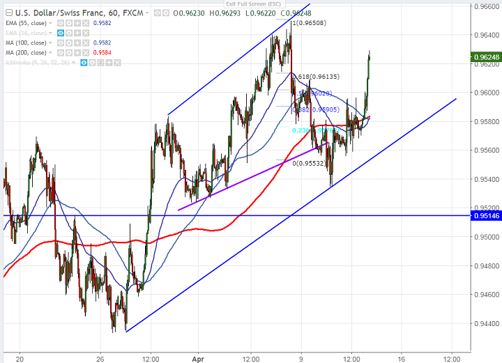 - USD/CHF has recovered sharply almost 100 pips from low of 0.9535 (Apr 10th 2018 low) after hawkish Fed FOMC minutes meeting. But upside is limited in USD/CHF for the near term as US-China trade war and geo political tensions will increase demand for safe haven asset. It is currently trading around 0.96230.
