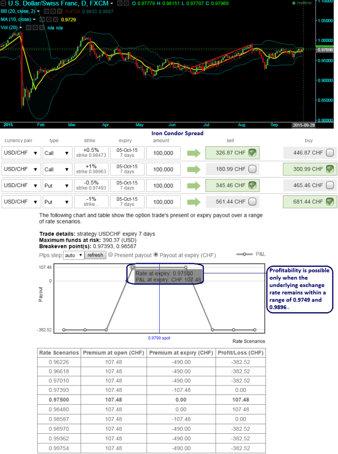 We advise shorting OTM put and buy deep OTM put, simultaneously short OTM call and deep OTM call options with identical maturities. Maximum loss for the iron condor spread is also limited but significantly higher than the maximum profit. It occurs when the exchange rate of USDCHF falls at or below the lower strike of the put purchased or rise above or equal to the higher strike of the call purchased. In either situation, maximum loss is equal to the difference in strike between the calls (or puts) minus the net credit received when entering the trade.