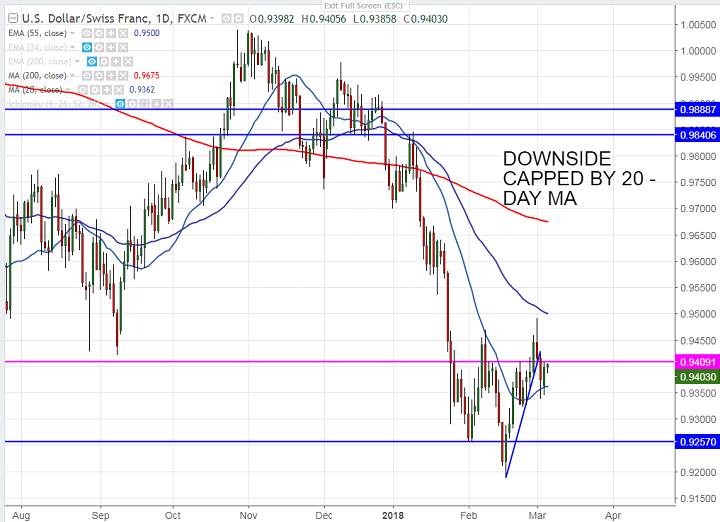 - USD/CHF has shown a good recovery after hitting low of 0.93384 slightly below 20- day MA. The pair formed almost triple bottom at 0.9320 and any bearish continuation can be seen below that level. The pair hits intraday high of 0.94050 and is currently trading around 0.9405.